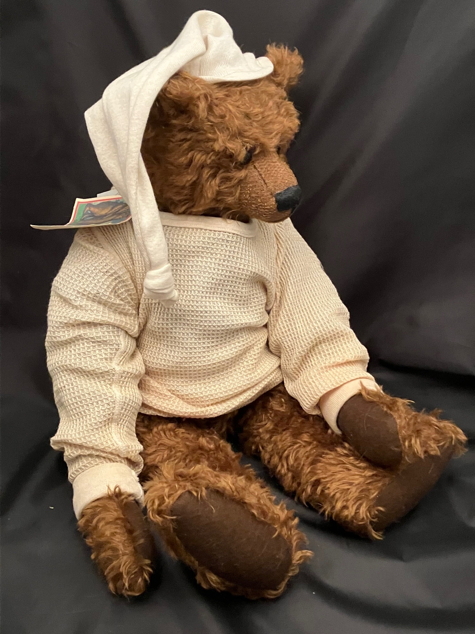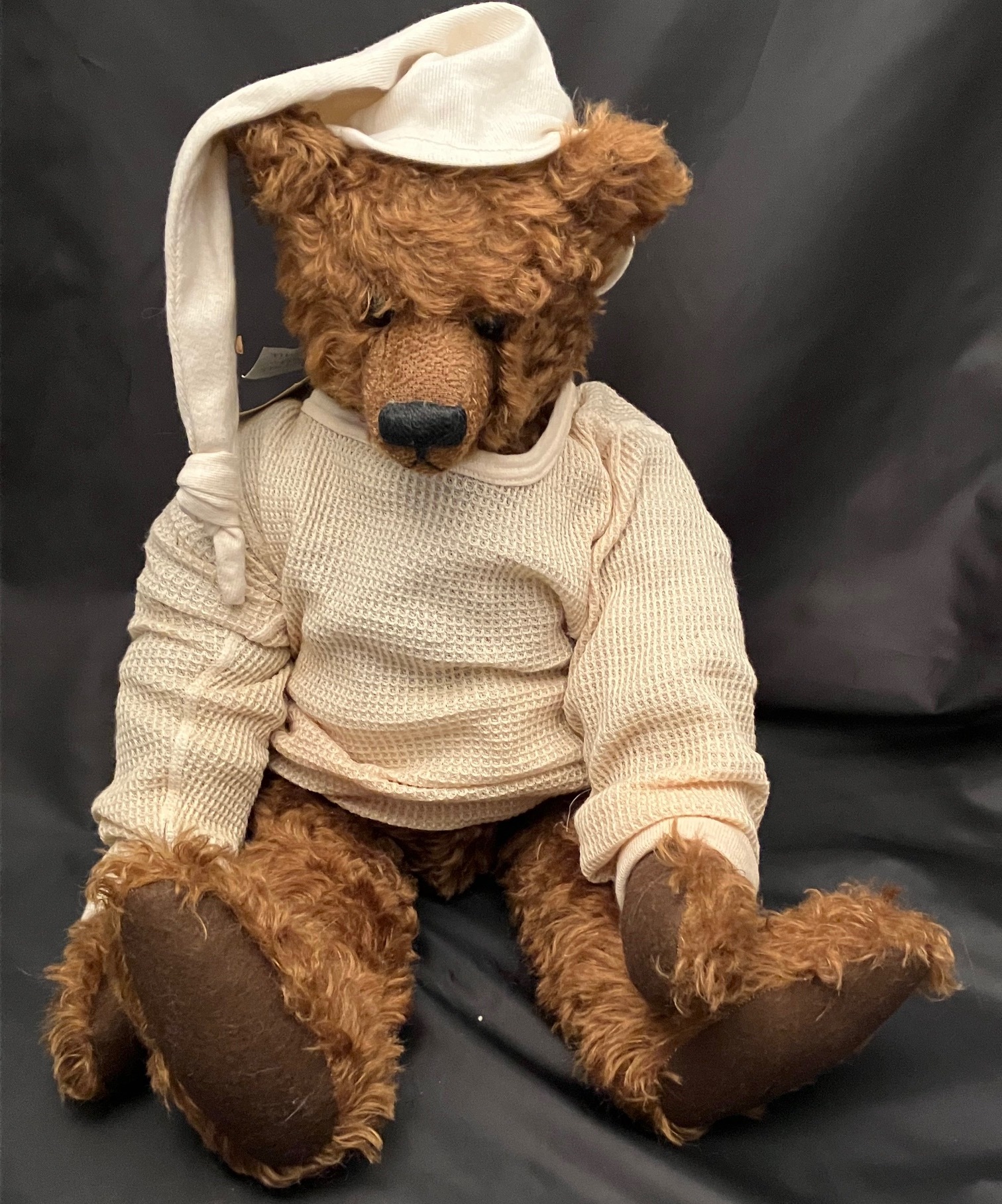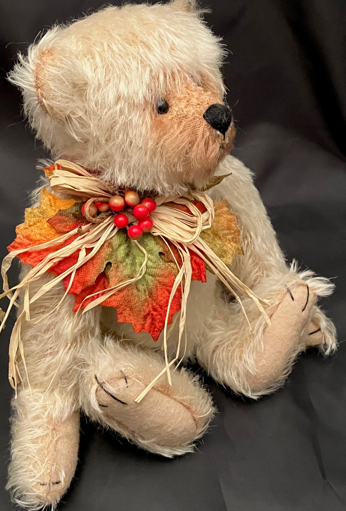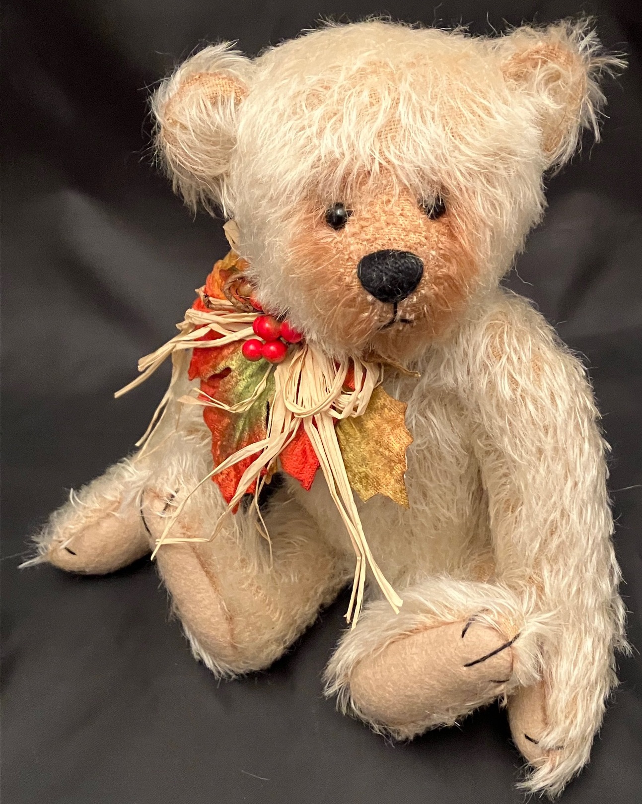 a recycled mink fur coat. He has black shoebutton eyes, and a hand-embroidered