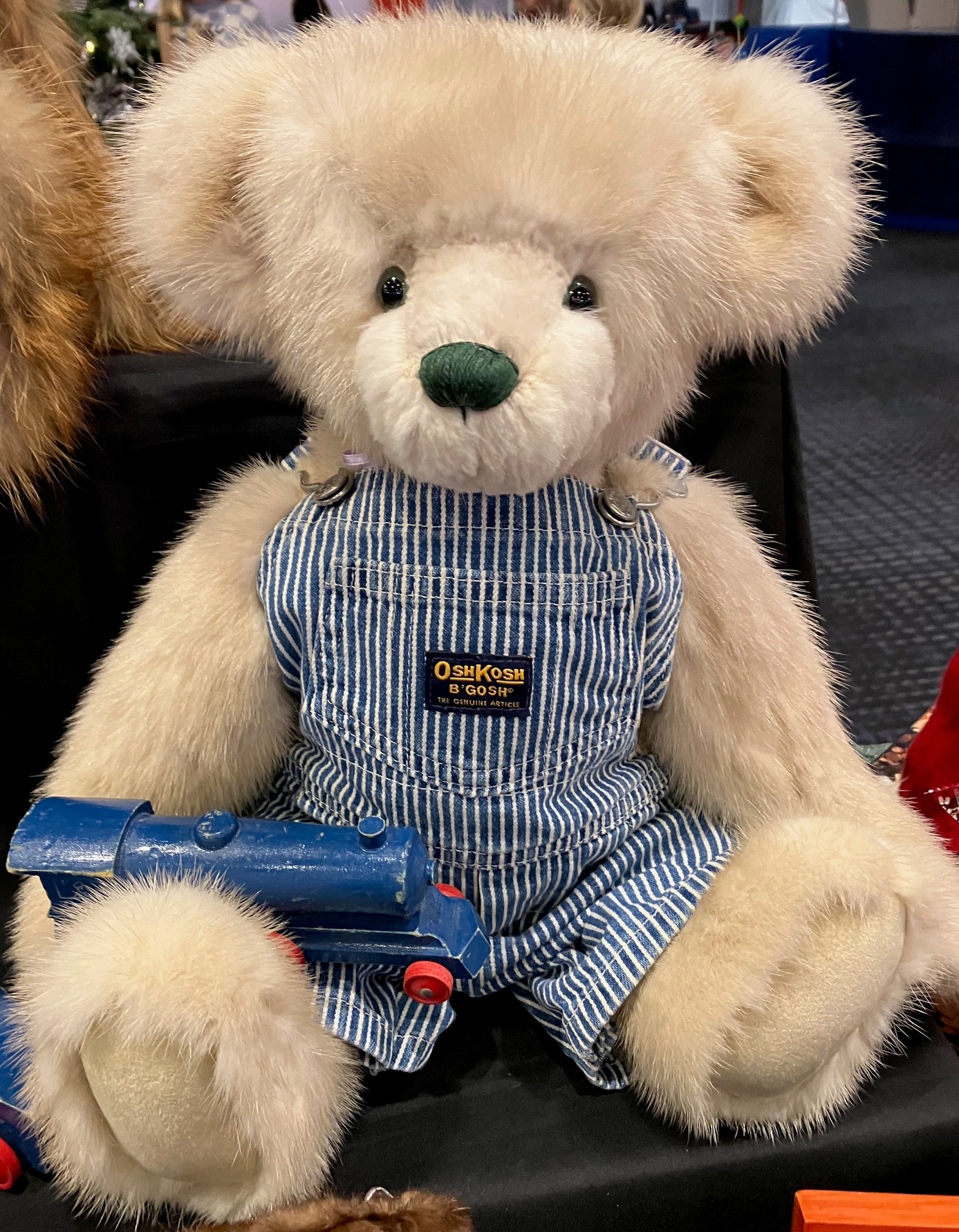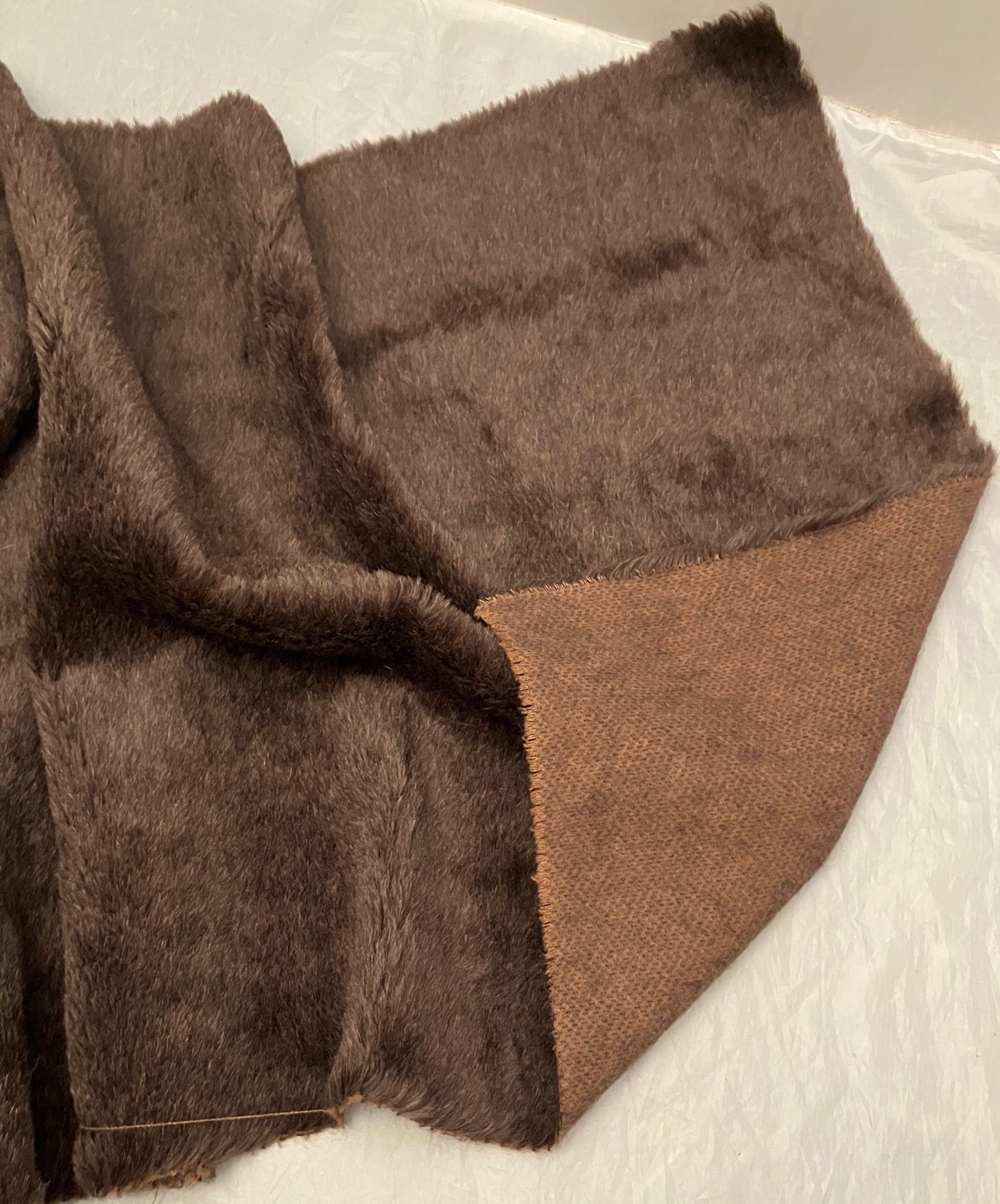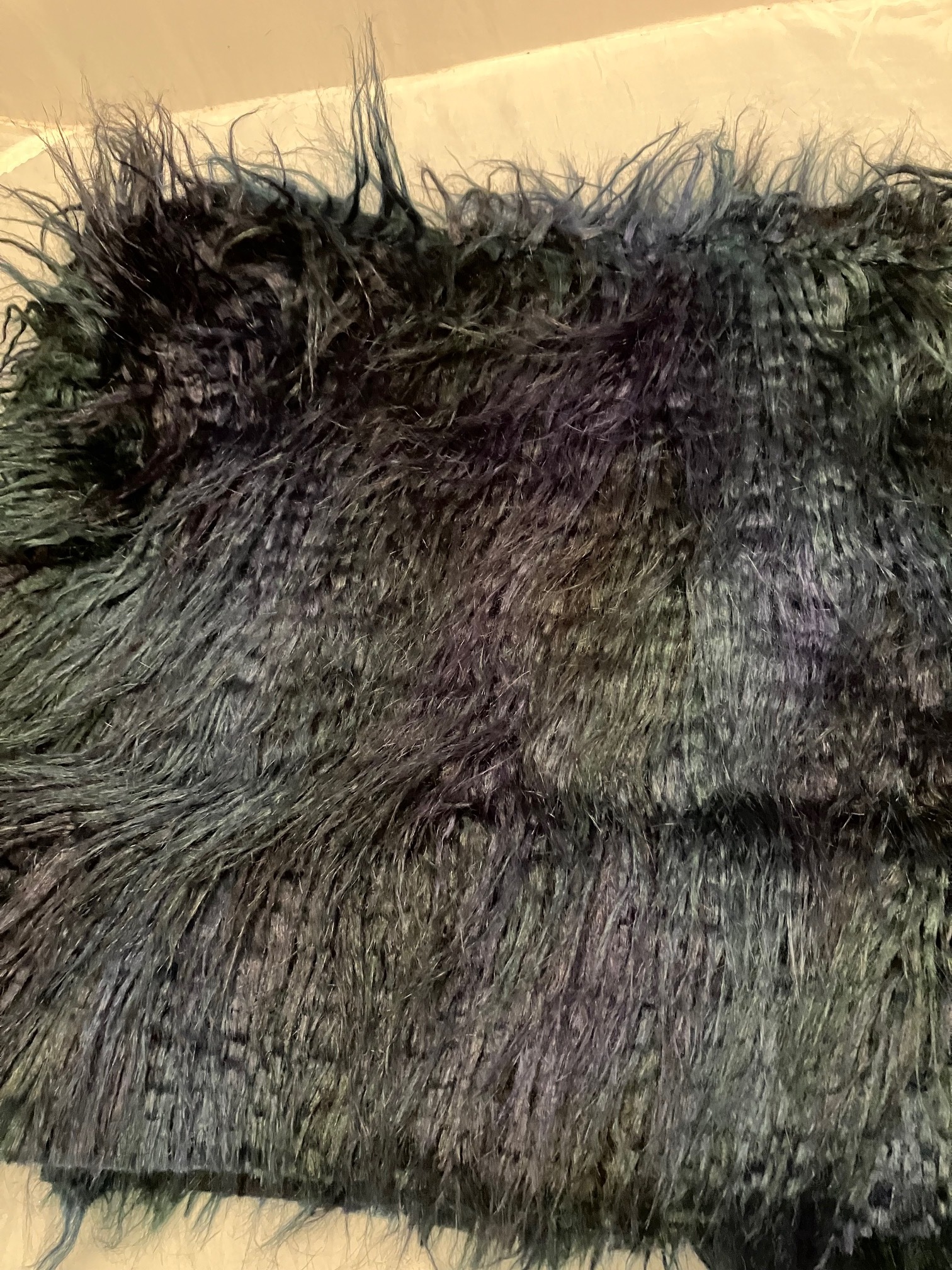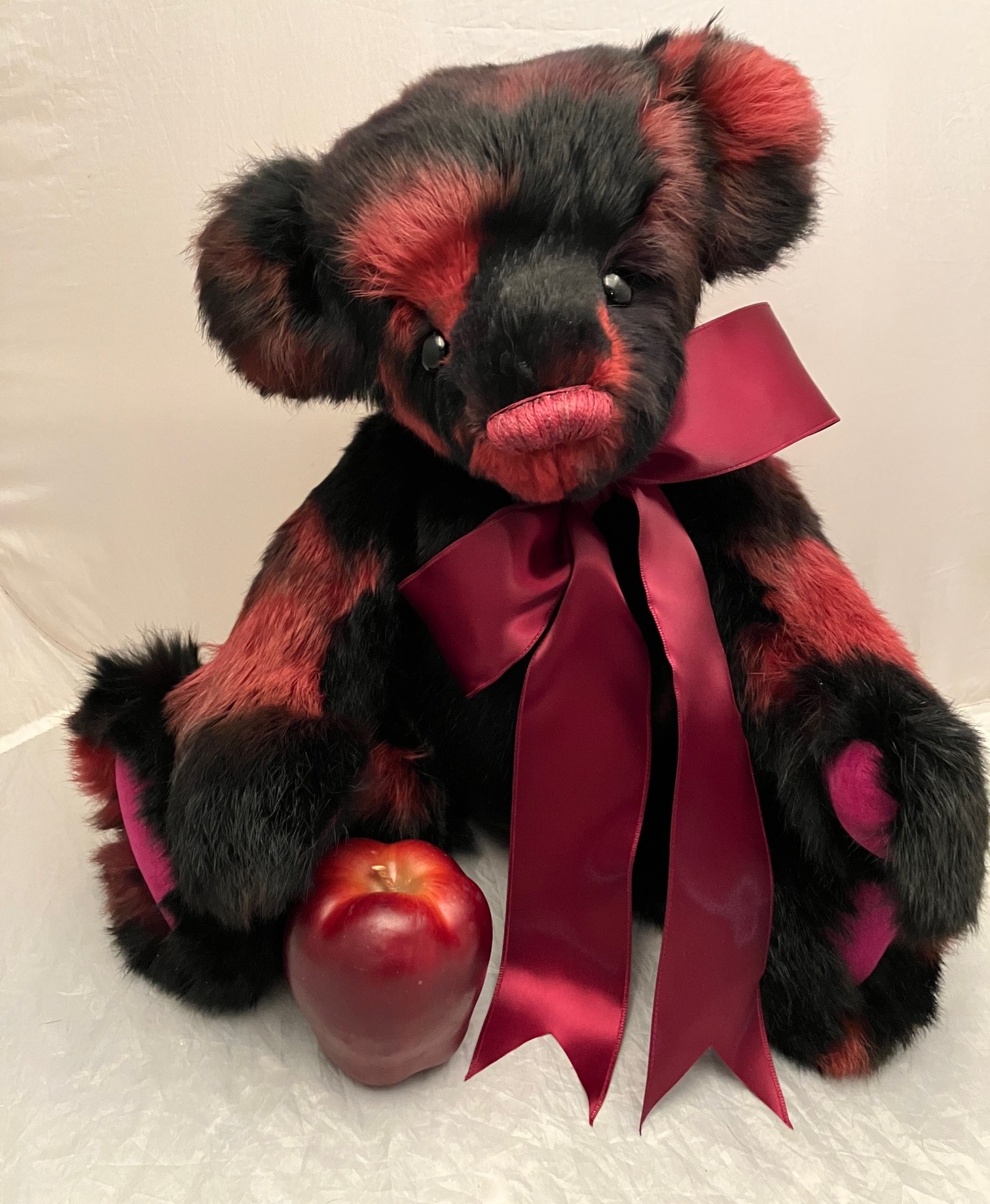 a recycled mink fur coat. He has black shoebutton eyes, and a hand-embroidered