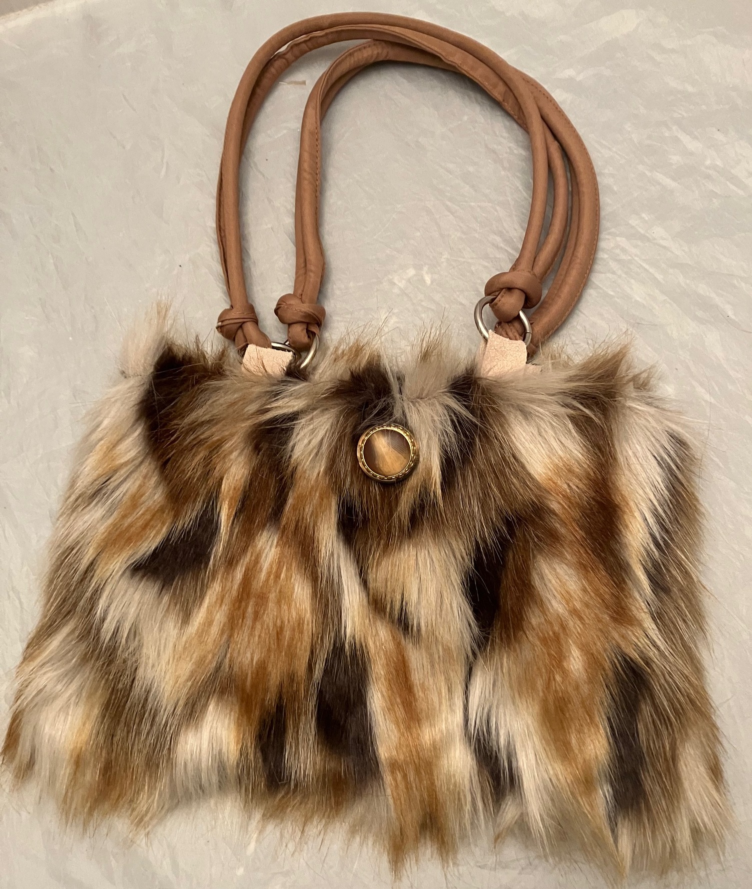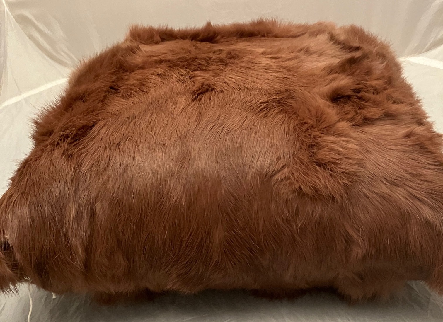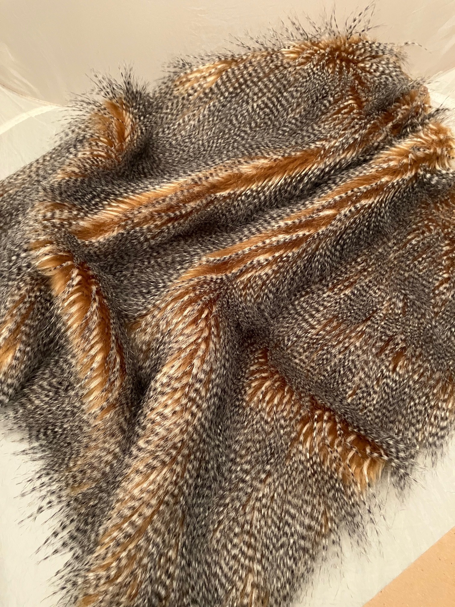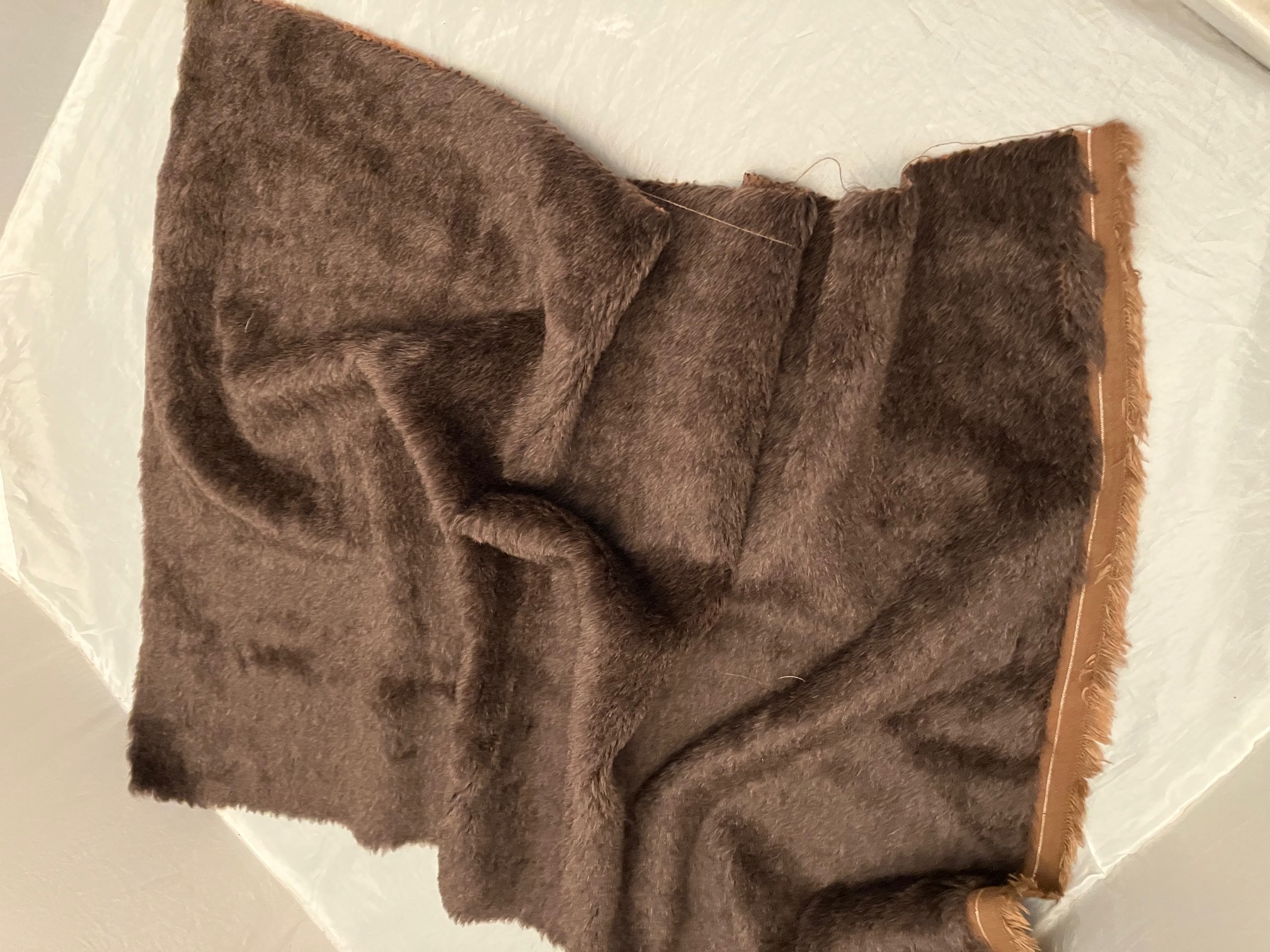 a recycled mink fur coat. He has black shoebutton eyes, and a hand-embroidered