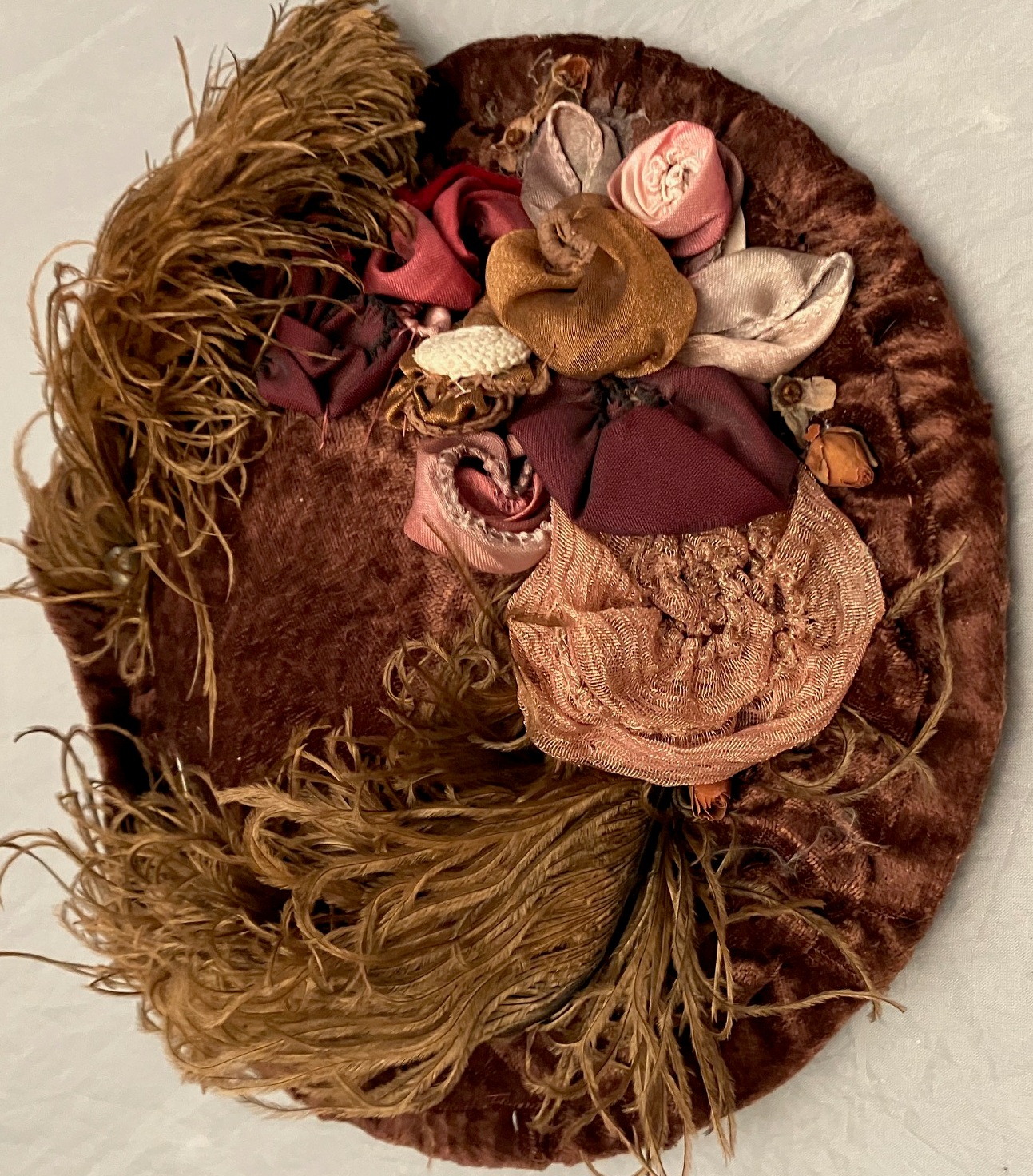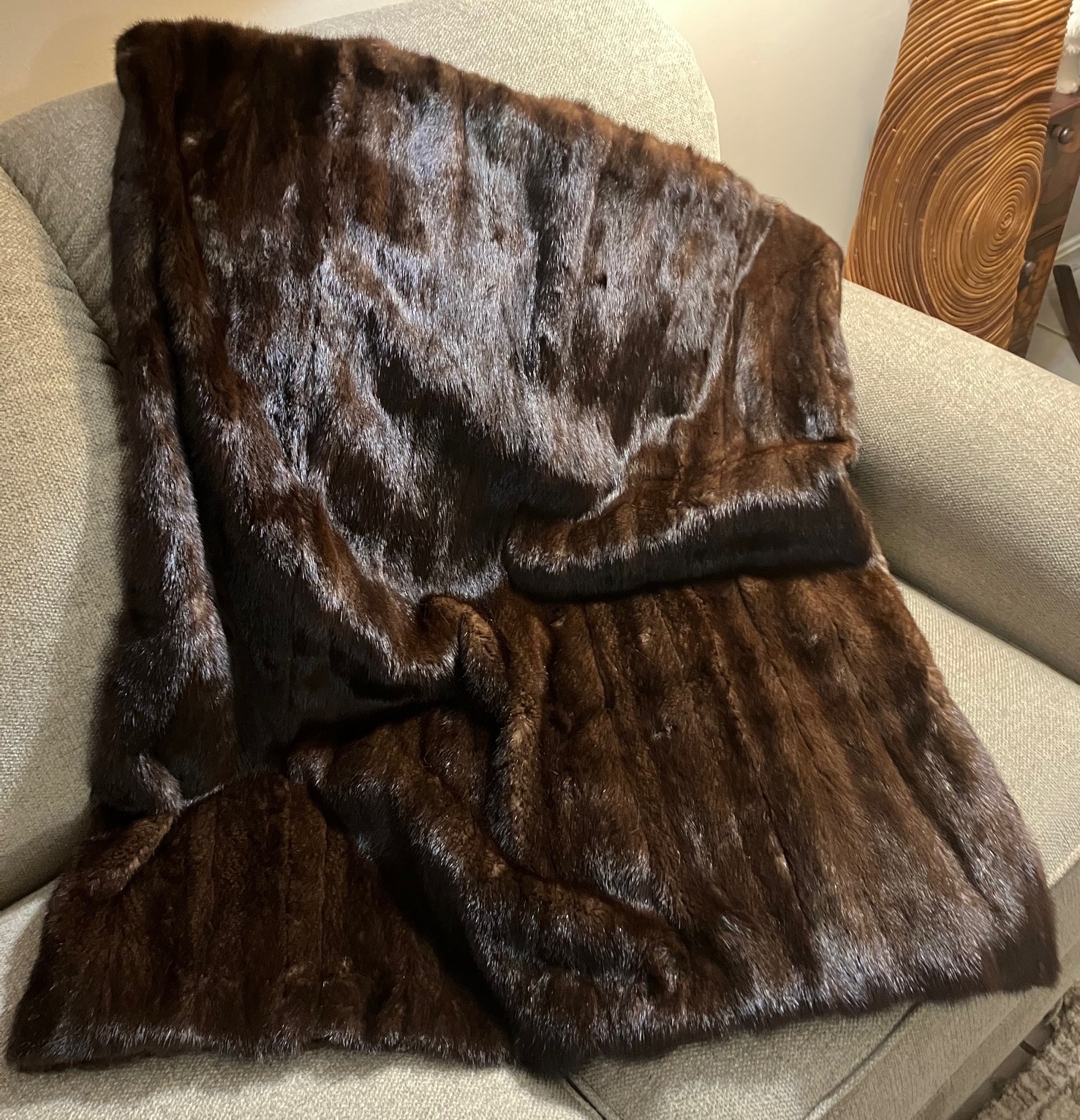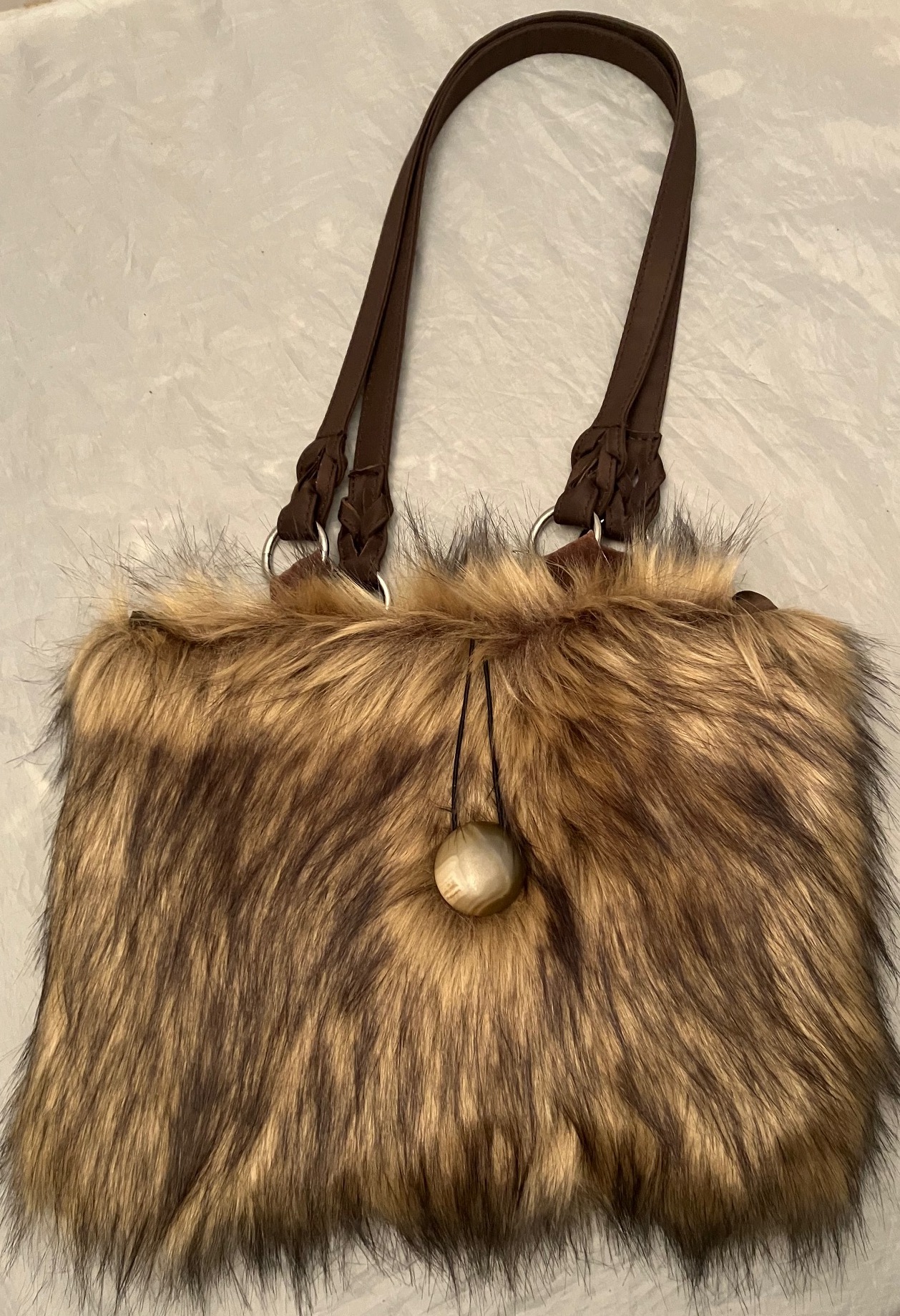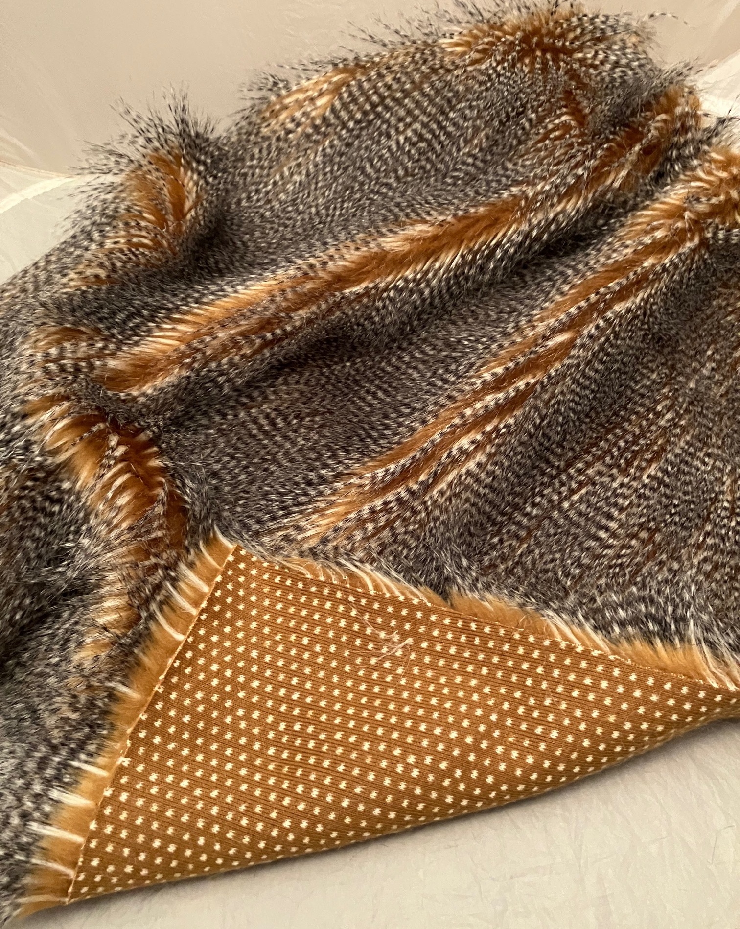 a recycled mink fur coat. He has black shoebutton eyes, and a hand-embroidered