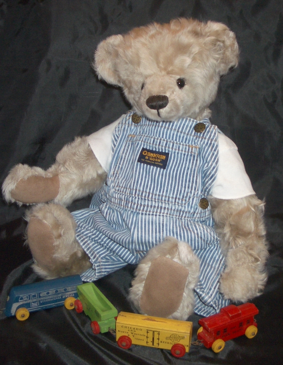 "Billy Bob" has tan suede paw pads, black glass eyes, and a hand-embroidered dark brown Perle cotton nose. He is firmly stuffed with polyester fiberfill, and is 5-way jointed. He wears a vintage white baby shirt under his favorite blue and white Osh-Kosh bib overalls. One-of-a-Kind $225.00 Sorry, I've already been adopted!