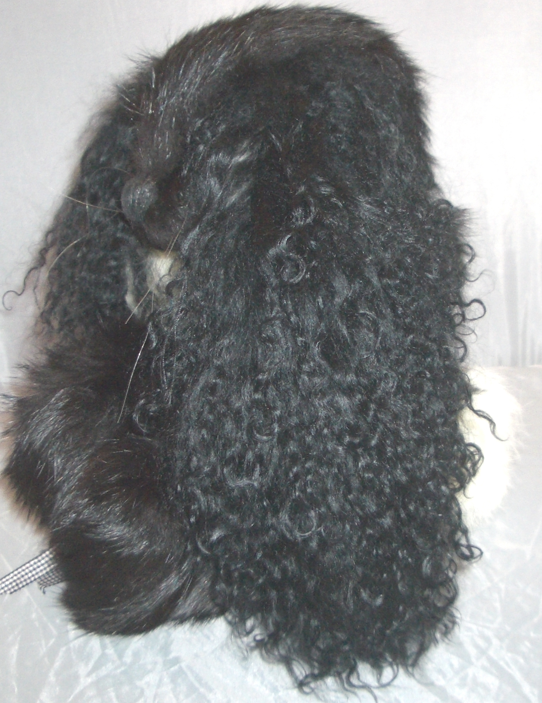 The outside of her ears are very curly, black Mongolian lamb fur.